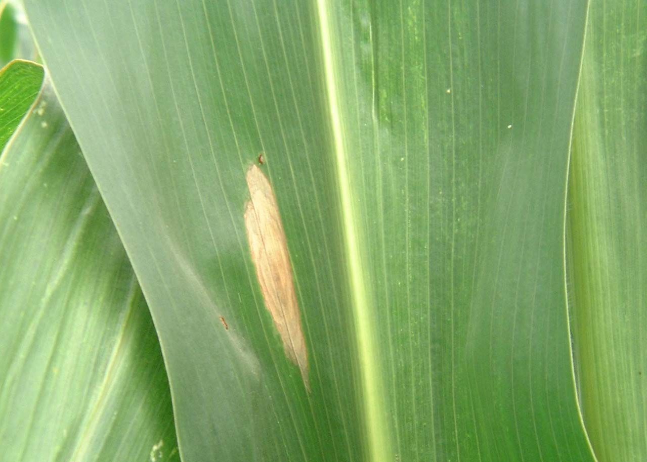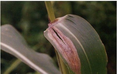 癥狀 主要發(fā)生在比較冷涼的深丘區(qū)和山區(qū),可危害所有玉米類型。 病菌主要危害葉片,也可侵染葉鞘和苞葉。植株感病后,常使葉片干枯,重者全株枯死,產(chǎn)量失收,輕者生長不良,造成減產(chǎn)。株高70~100厘米時,先由基部葉片發(fā)病,漸及上部,嚴(yán)重時能遍及全株。發(fā)病初期,葉片上出現(xiàn)水漬狀青灰色或灰綠色斑點(diǎn),然后沿葉脈向兩端擴(kuò)展,形成棱形或長紡錘形大斑。斑中央淡褐色,邊緣暗褐色。病斑寬可達(dá)1~2厘米,長15~20厘米。天氣潮濕時,病斑上可產(chǎn)生黑灰色霉?fàn)钗铮ǚ稚咦樱?。發(fā)病嚴(yán)重時,病斑增多,連成大片,整株枯死。